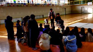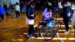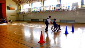 4年生は、総合的な学習の時間に、「福祉」について学習しています。今日は、社会福祉協議会の職員の方にお越しいただき、「車いす体験学習」を行いました。スーパーや病院などで見ることがある車いすですが、実際にどのように乗ったり、介助したりするのかをていねいに教えていただきました。そして、段差や幅の狭い通路を車いすで通る体験を通して、車いすを使っておられる人の気持ちを考えることができました。この「車いす体験学習」は、車いすを使っておられる人に寄り添える貴重な体験となりました。