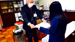 本日の中休み、校長室で「青少年書展」で金賞を受賞した児童に賞状が渡されました。受け取った児童は校長先生から、「これからもがんばってください。」と言葉をかけてもらうと、とてもうれしそうな笑顔を見せてくれました。表彰されたという素晴らしい経験が自信につながったと思います。この経験をこれからの学校生活に活かしてくださいね。