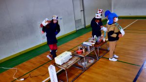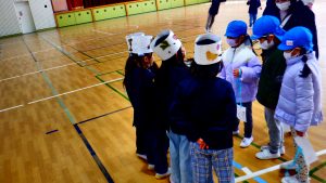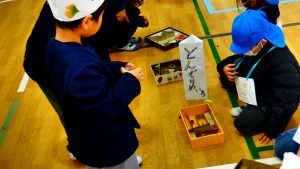 本日、1年生は、南郷里幼稚園の園児を体育館に招いて、おもちゃランドを開きました。「たいこ・マラカス」、「どんぐりコースター」、「どんぐりごま」、「まつぼっくりけんだま」、「さかなつり」、「あきのまと入れ」、「どんぐりめいろ」の各コーナーでは、1年生が優しく遊び方を教えたり、幼稚園の園児が楽しく遊んだりする姿が見られました。おもちゃランドを通して、「来年は2年生になる。」という自覚が感じられ、また一つ大きな成長が伺われました。