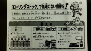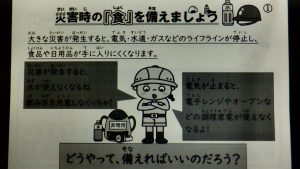 今月の食育のテーマは、災害時の食についてです。大きな災害が発生すると、電気・水道・ガスなどのライフラインが停止し、食品や日用品が手に入りにくくなります。日常的に、食品を少し多めに買い置きし、使ったら買い足す「ローリングストック」という方法があります。災害は、いつ起きるか分かりません。日頃から災害時の「食」を備えておきたいものですね。